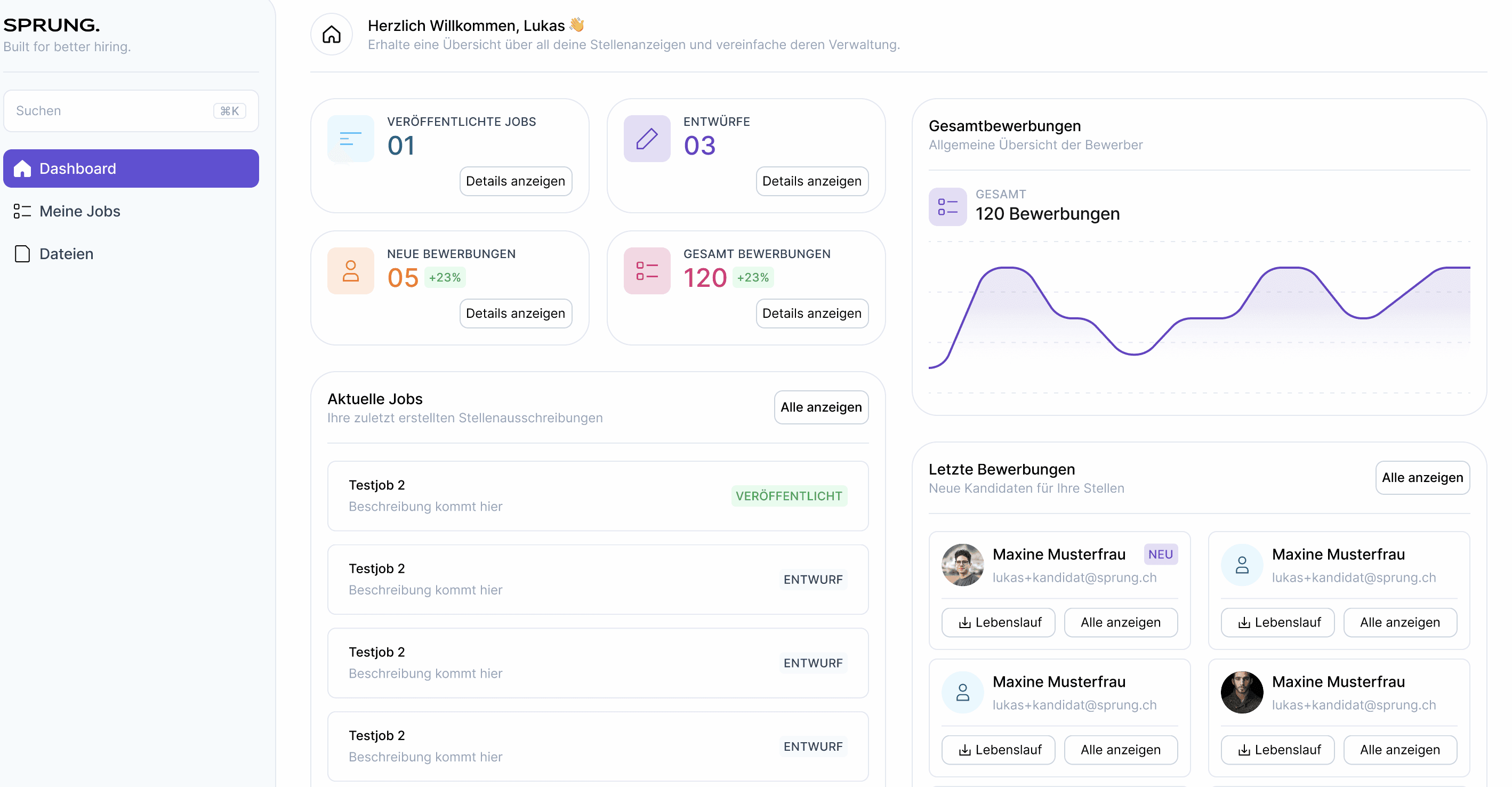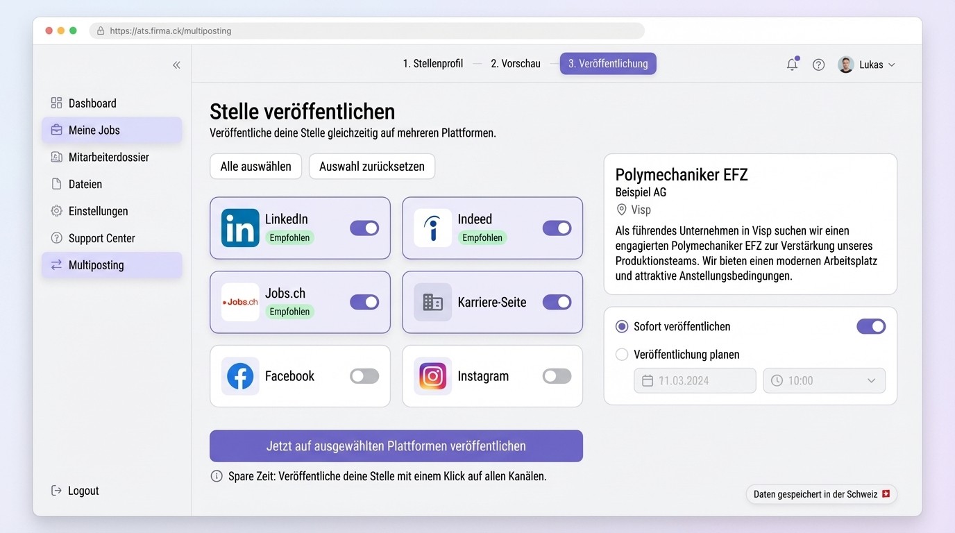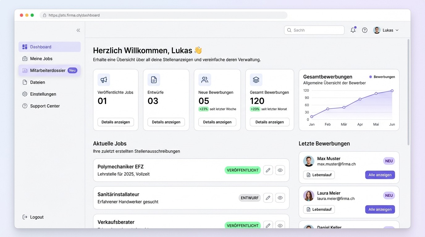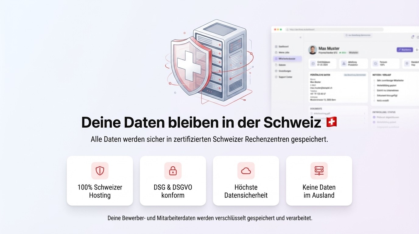 Stellenveröffentlichung, Bewerbungsmanagement und Mitarbeiterdossiers — entwickelt für Schweizer KMU. Gehostet in der Schweiz.