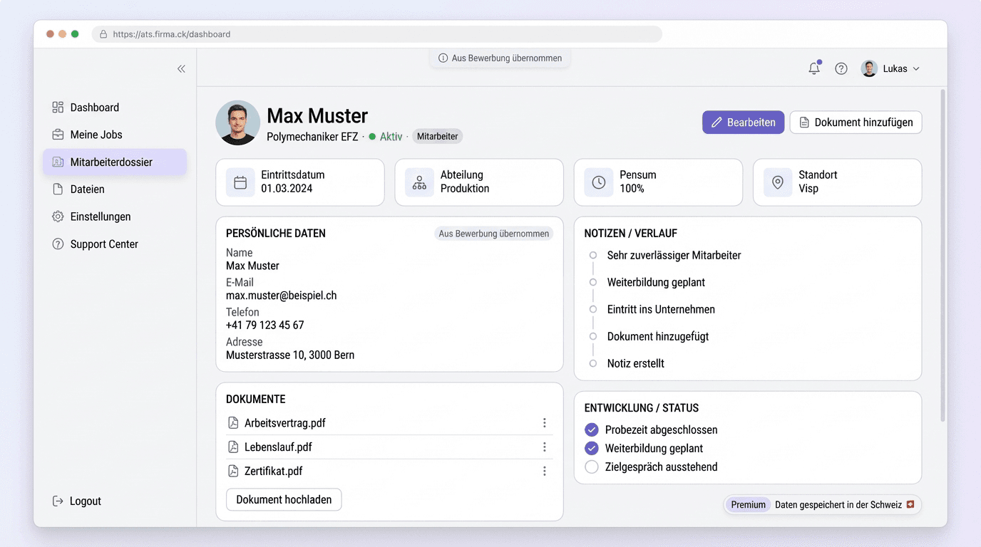 Von der Stellenausschreibung bis zum Mitarbeiterdossier — alles in einem System für Schweizer KMU.